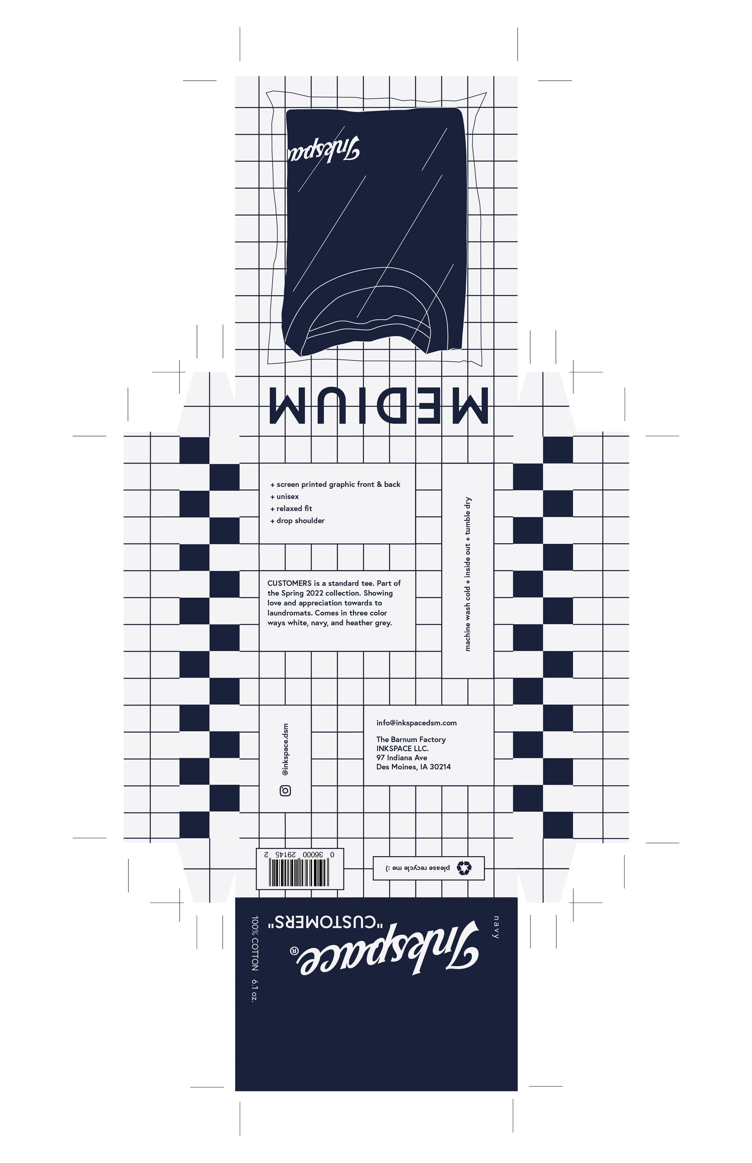 For regular packaging, the box had to have a standard shape and size. It was meant to hold one t-shirt and make the product feel luxurious. Usually, t-shirts don't come in boxes. By putting them in a box, it becomes special to the brand. What stands out in this package design is the big print on the top of the box; when these boxes are shown, it's easy to read the size the customer wants.