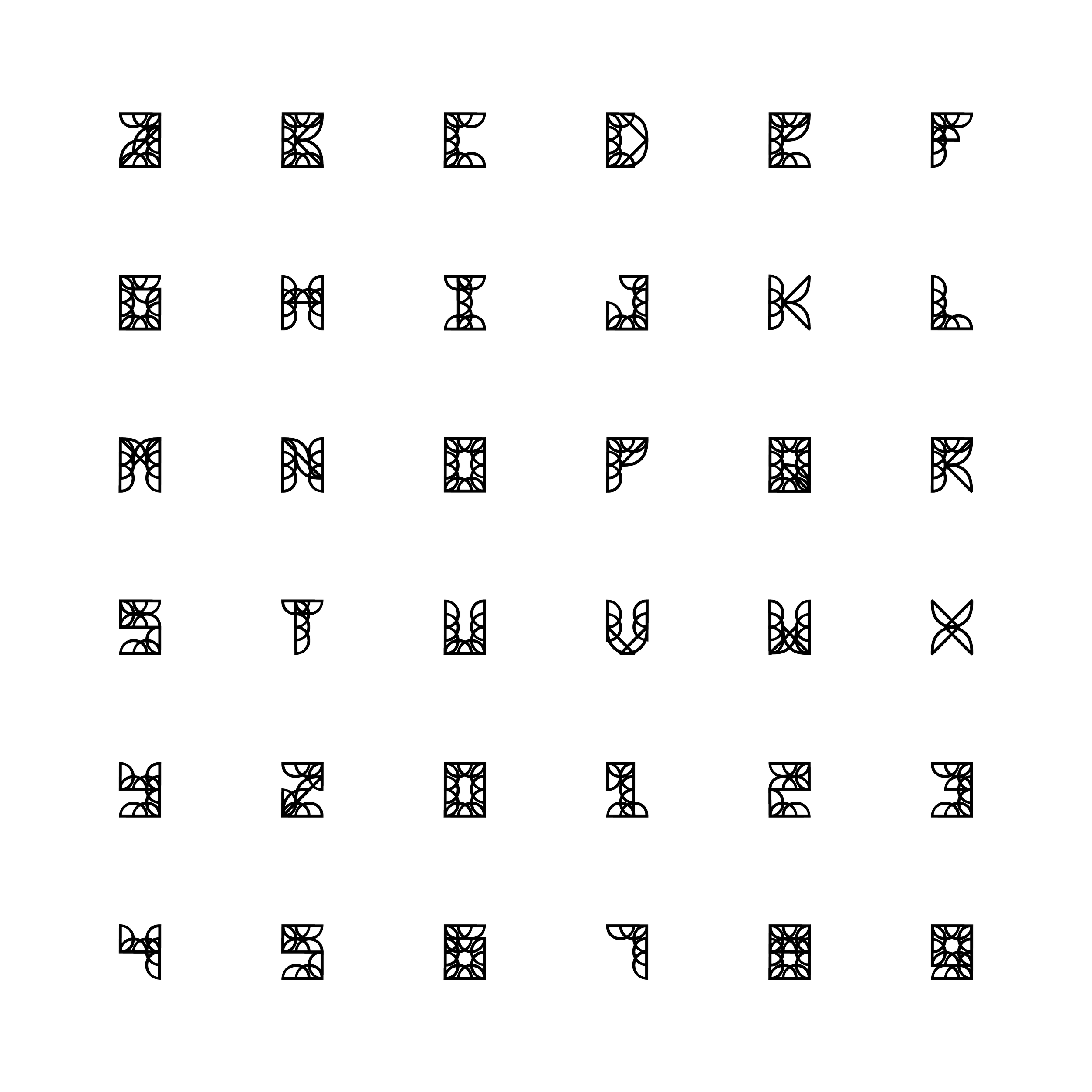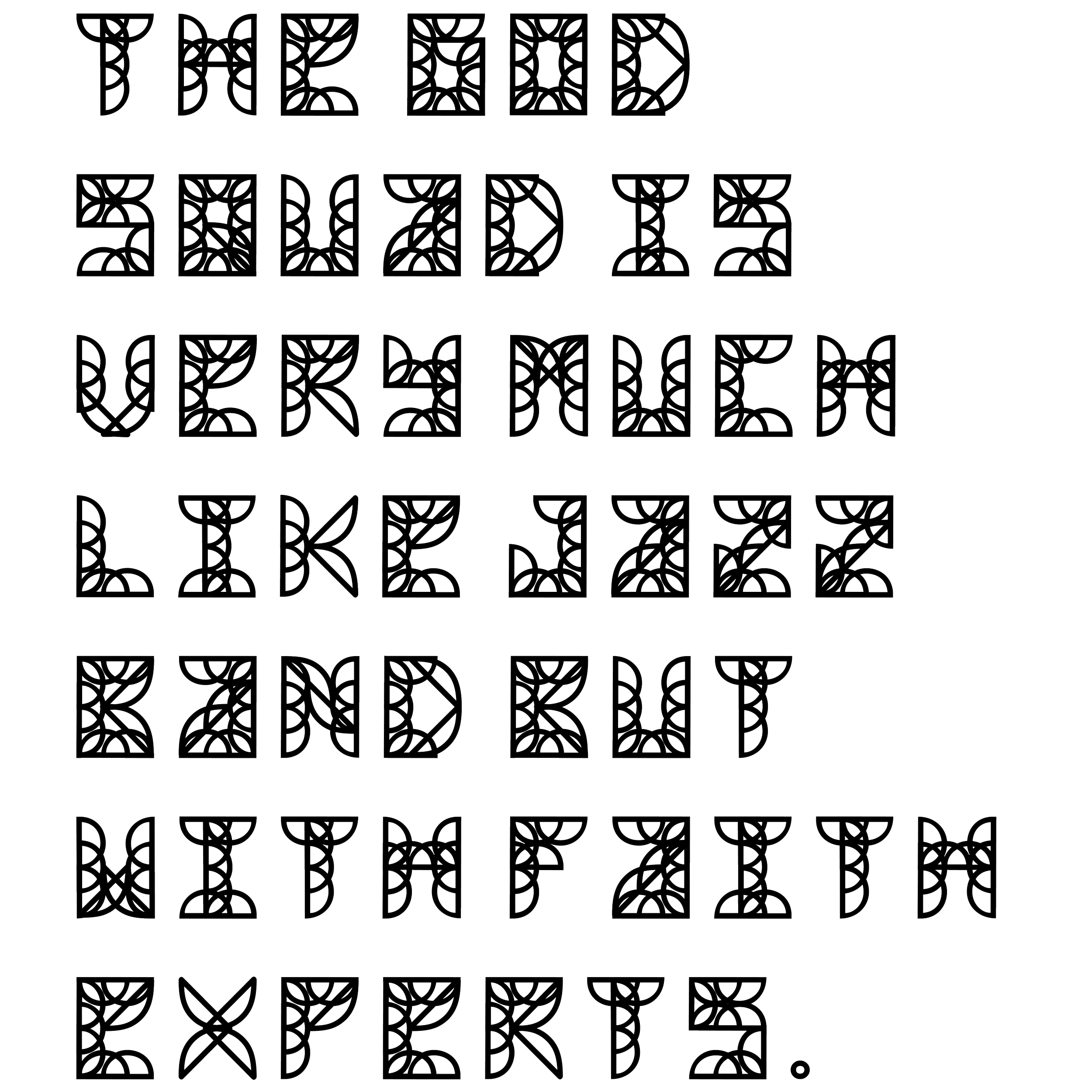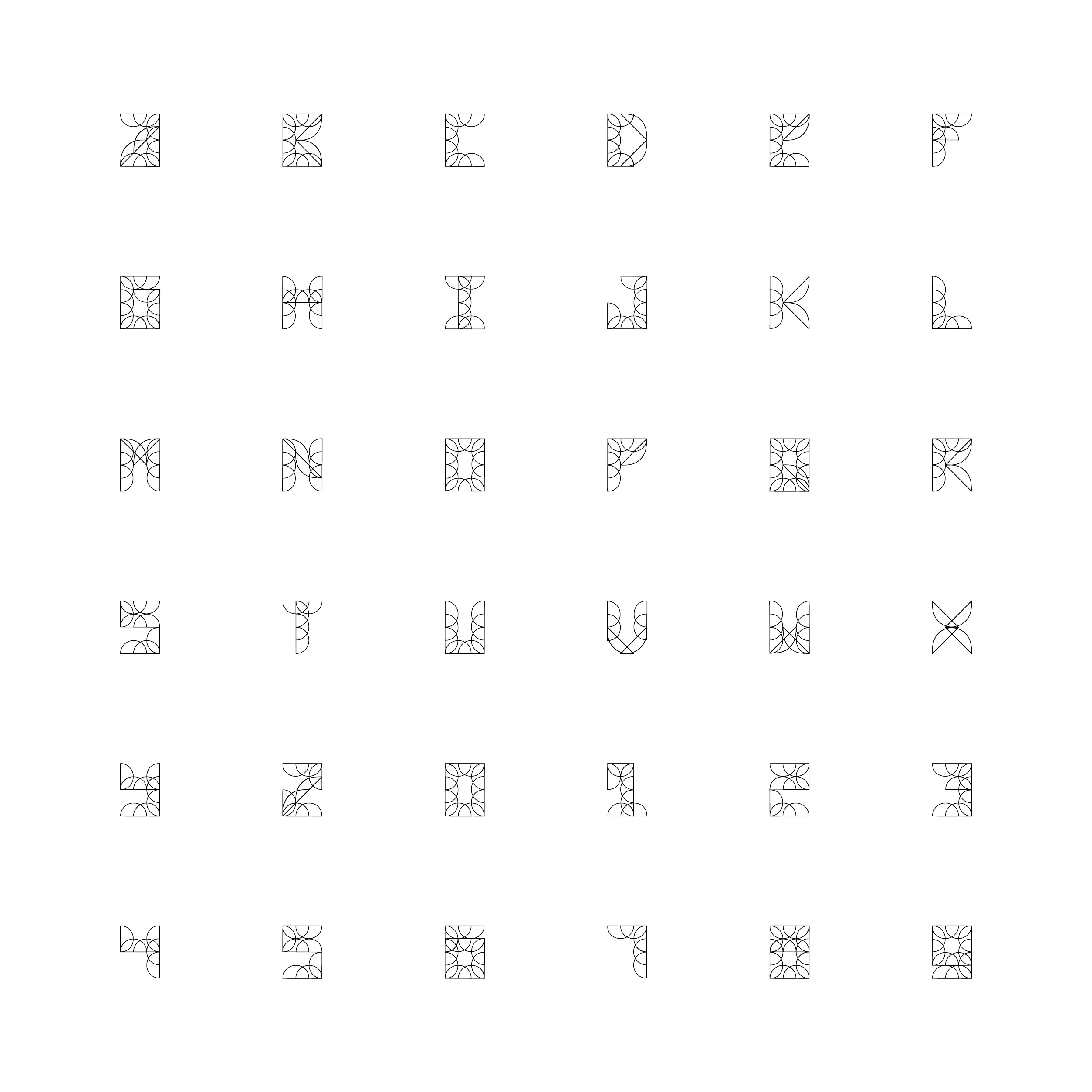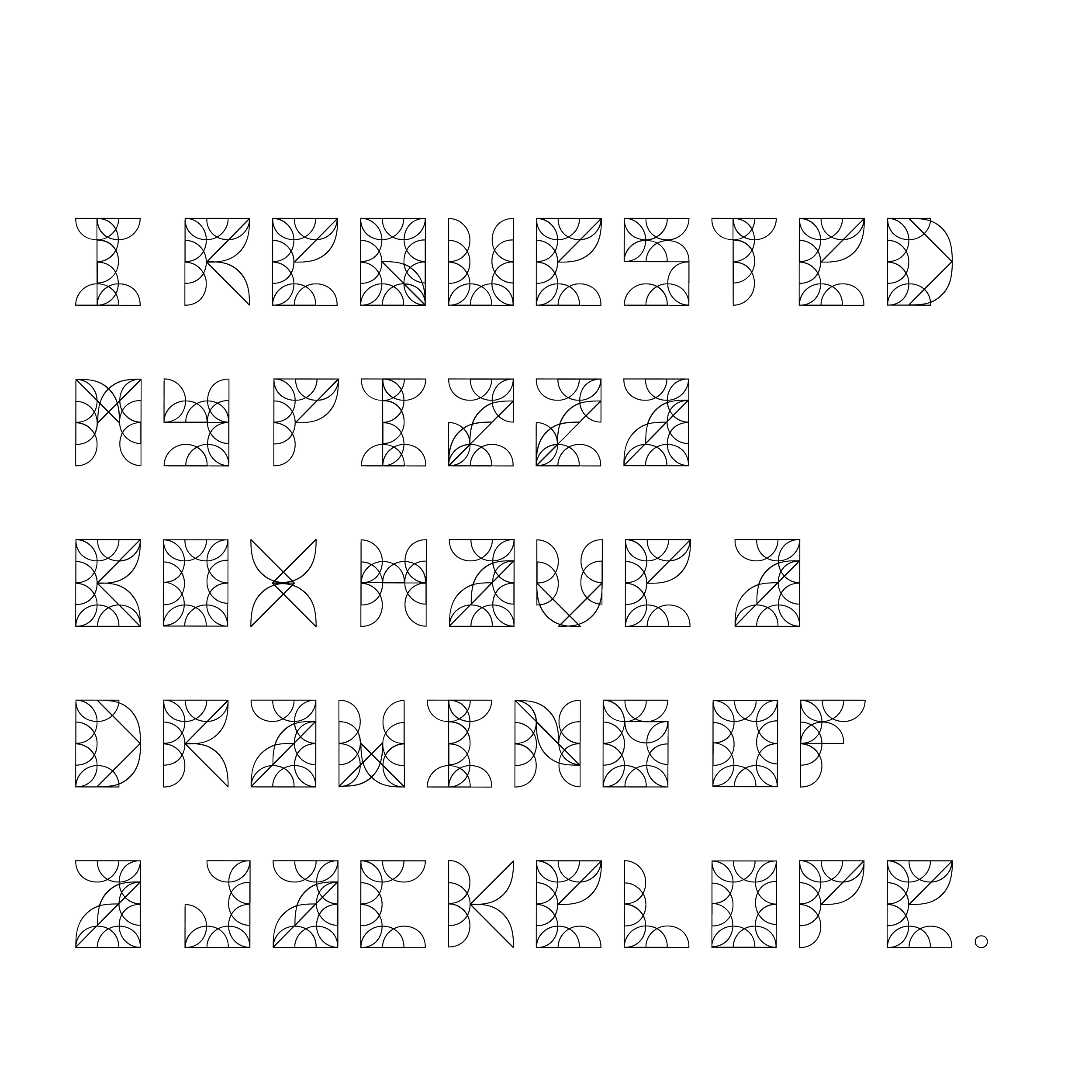 Halves is a script with two shapes in a 3x4 grid. The first shape is made from circles cut in half vertically and horizontally. The second shape is half of a circle cut diagonally. The script has two font styles: regular and bold. I used both uppercase and lowercase letters to within the script rules.